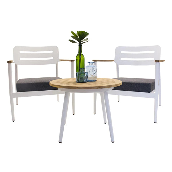 The structure of the armchairs and the table is made of aluminum with a matt white paint finish. The arms of the armchairs and the surface of the coffee table are made of teak wood. Gray water-repellent fabric seat cushion.